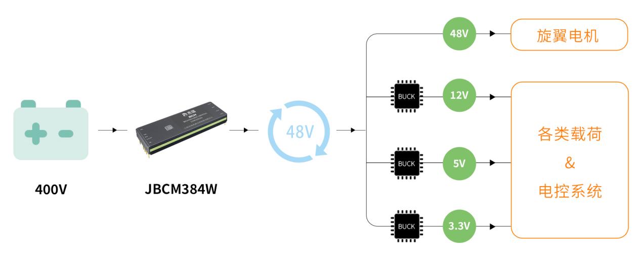 該系列產品屬于DC/DC固定變比變換器,對中間總線進行高低壓隔離變換,采用MHz級諧振軟開關電路拓撲和模塊級高導熱半導體封裝工藝,具有高效率、超高功率密度、超小體積、超輕重量、低EMI等突出優(yōu)點。常用的8:1變比48V輸出型號,輸入電壓范圍260-410V,額定輸出功率1680W,峰值功率可達1750W,峰值效率97.5%,尺寸63.34×22.8×7.21mm,功率密度高達2735W/in3,重量僅41g,可支持8臺并聯靈活拓展輸出功率。該模塊輸出48V電壓為無人機旋翼電機提供動力,同時經過二次降壓轉換為12V/5V/3.3V等組成分布式供電網絡為無人機各類載荷以及電控系統(tǒng)提供可靠供電。采用杰瑞兆新JBCM384W系列設計系留無人機供電方案,與市面常規(guī)電源方案相比,在高效率、輕量化方面的性能優(yōu)勢明顯。