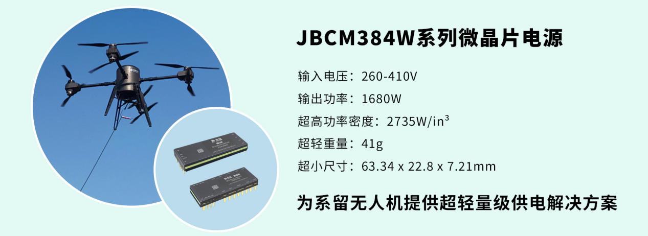 如何將線纜傳輸的高電壓在無人機平臺中安全高效地降至無人機系統(tǒng)所需的低工作電壓,同時電源轉換系統(tǒng)的體積和重量盡量小,盡可能降低無人機自身載重,節(jié)省系統(tǒng)內部空間,是無人機供電設計中面臨的最大挑戰(zhàn)。針對這個設計痛點,杰瑞兆新全新推出的JBCM384W系列超高功率密度微晶片電源,為系留無人機提供超輕量級供電解決方案。